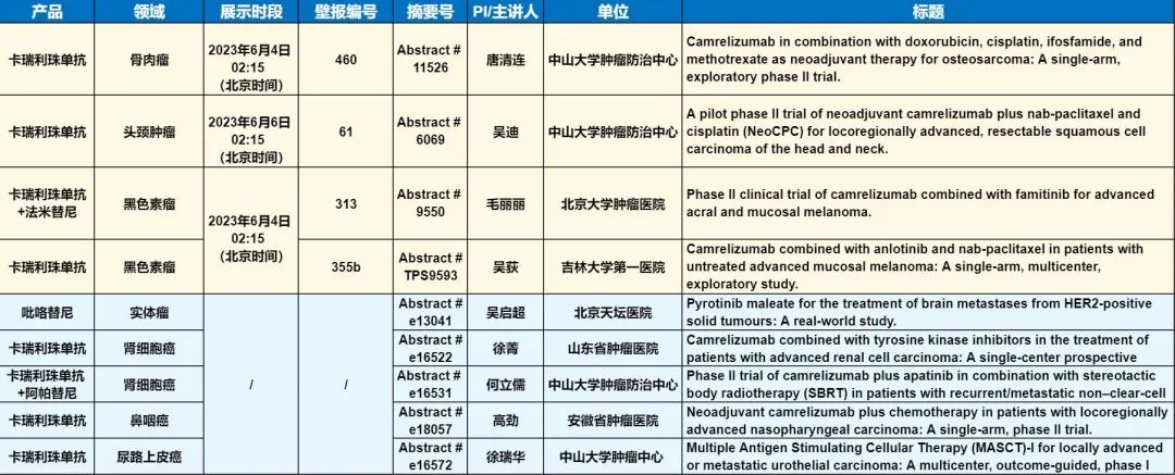 此外,在头颈肿瘤、黑色素瘤、骨肉瘤、鼻咽癌、肾细胞癌、尿路上皮癌等多个领域,卡瑞利珠单抗、吡咯替尼等产品相关研究一共入选了4项壁报展示和5项线上发表,彰显了尊龙凯时医药强大的自主研发综合实力。